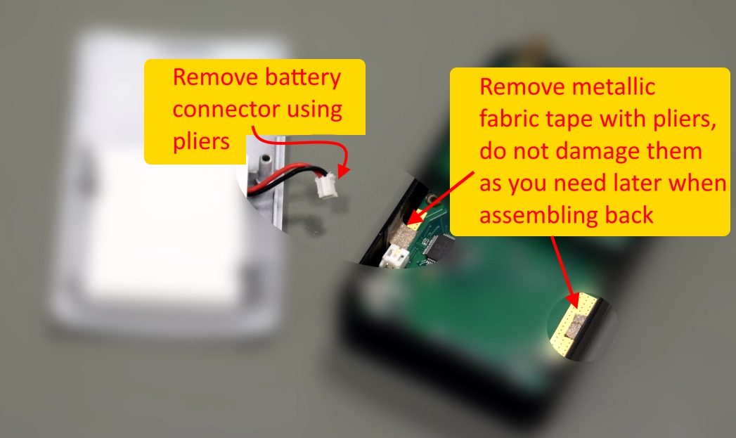 Disconnect battery carefully using fine pliers, then remove the metallic tape from the PCB and middle cover.