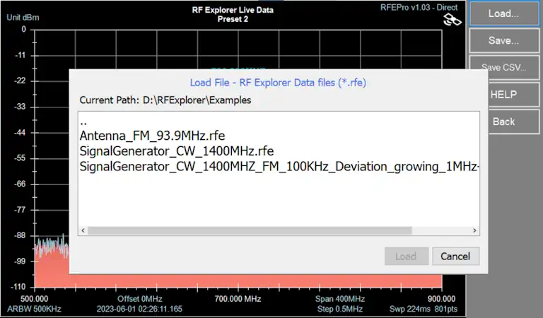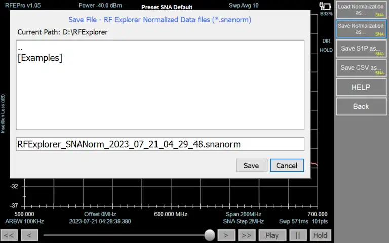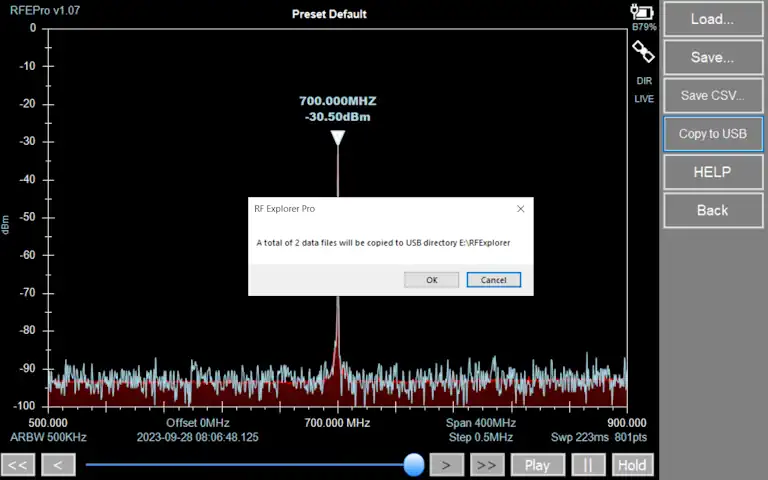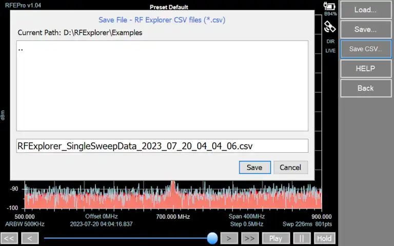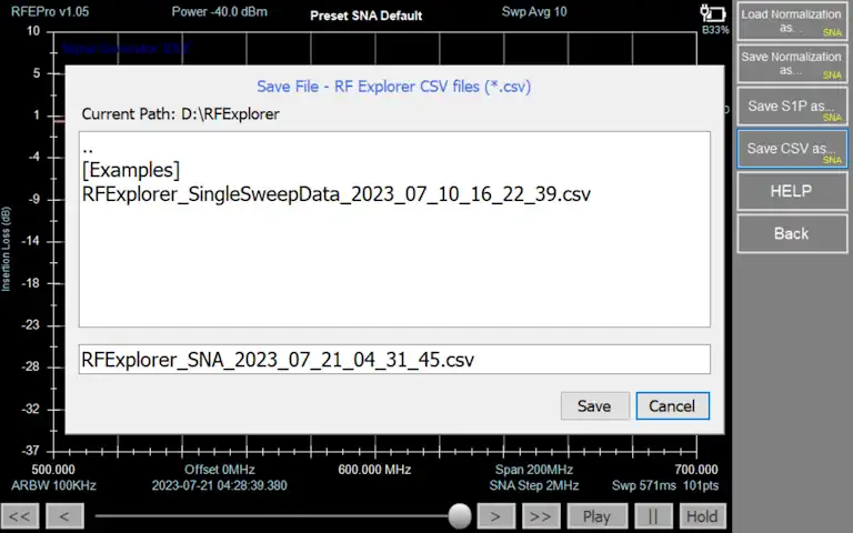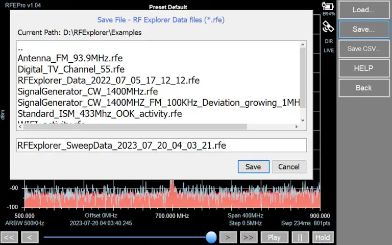 In RF Explorer Pro model, by default files are stored in USB removable drive if available, otherwise the target directory will be “MyDocuments\RFExplorer”