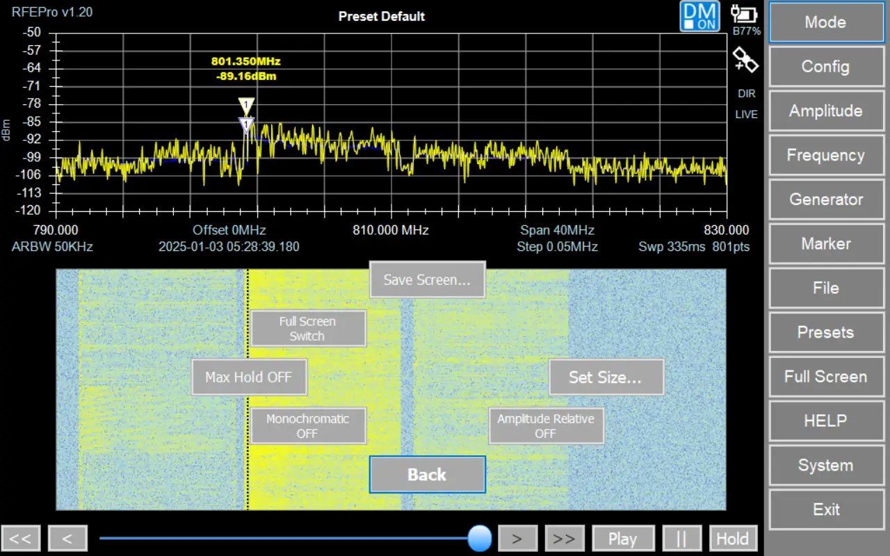 Full Screen Switch: Toggles between the normal view and a full-screen display, providing a clearer view of the spectrum when necessary.