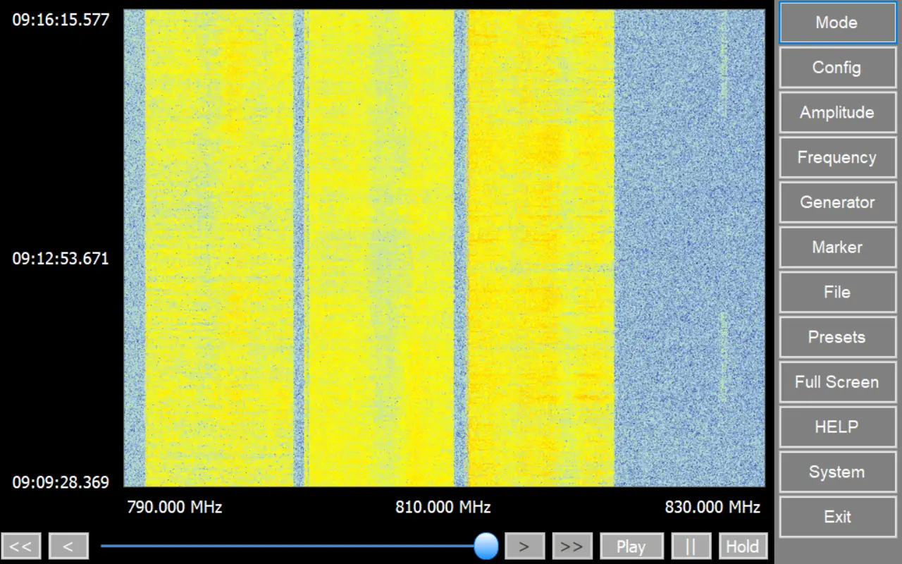 The color map used by the Waterfall screen is defined by the Top and Bottom amplitude signals configured on the spectrum analyzer.