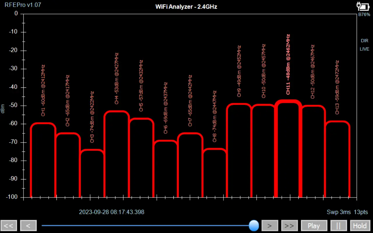 Display view for channels from 1 to 13 including center channel frequency and channel power.