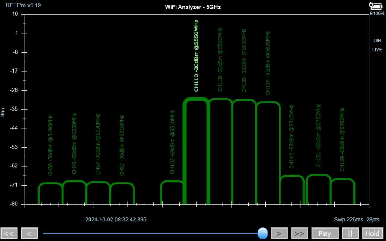 For the 5GHz and 6GHz WiFi bands, you can select which channels to display by navigating to Config > Display in the menu. From there, choose between the available channel widths: 20MHz, 40MHz, 80MHz, or 160MHz.