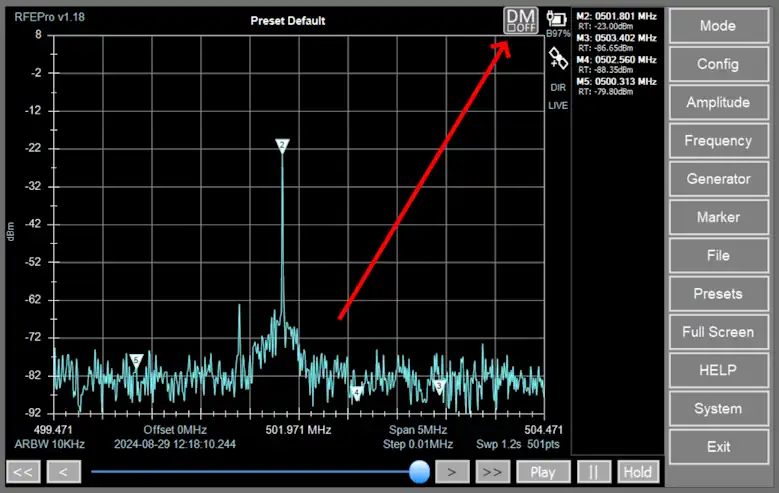 Starting with firmware v1.18, a new button labeled 'DM' appears at the top right corner, which is set to OFF by default. By clicking on it, you enable Dynamic Marker mode, and the button changes to the ON position.