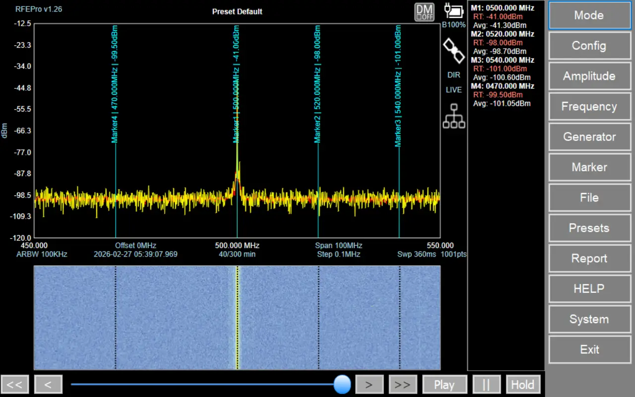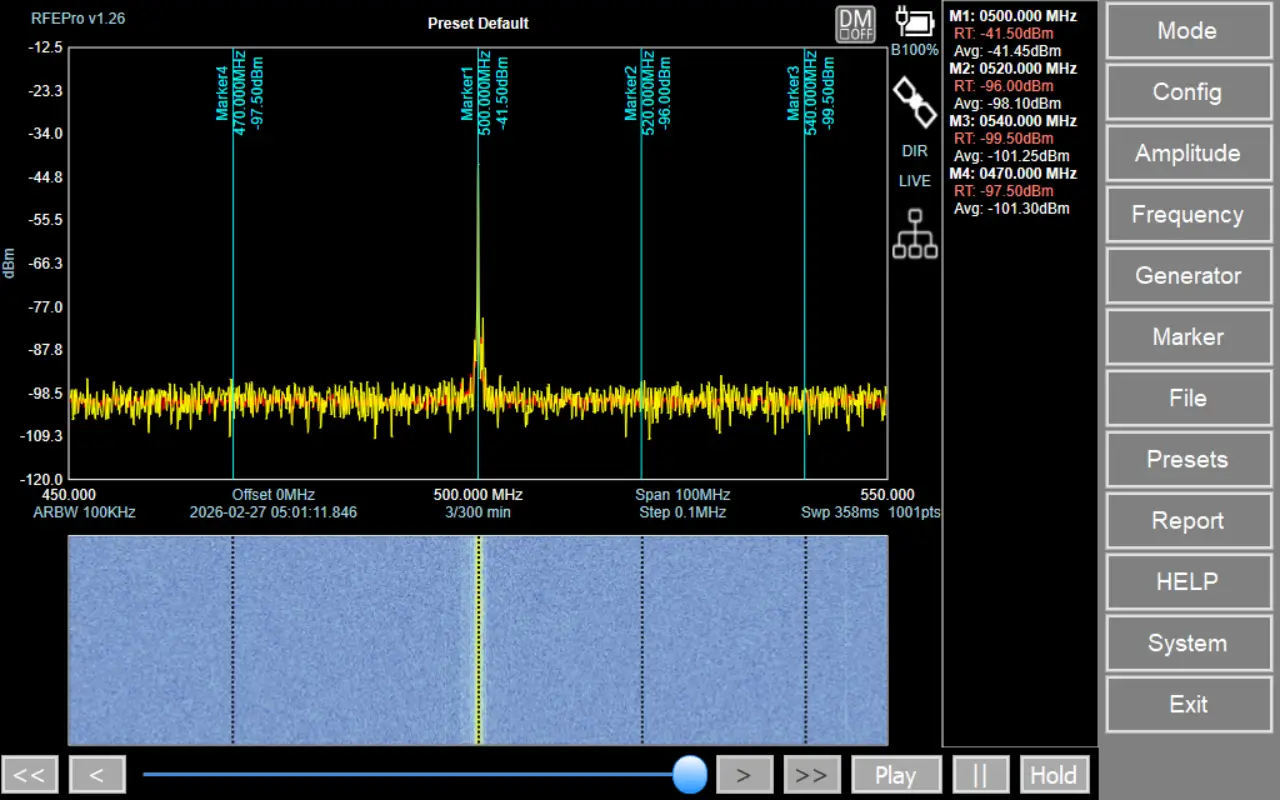 This feature is particularly useful for identifying significant events on the spectrum. By automatically pointing to the exact frequency of any signal or event of interest, the Dynamic Marker helps you understand spectrum behavior with pinpoint accuracy.