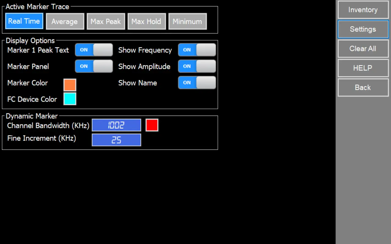 Go to the Settings menu, and in the Active Marker Trace section, select the desired trace to track, such as Real Time, Average, Max Peak, Max Hold, or Minimum. (Marker 1 will detect peaks on the selected trace.)