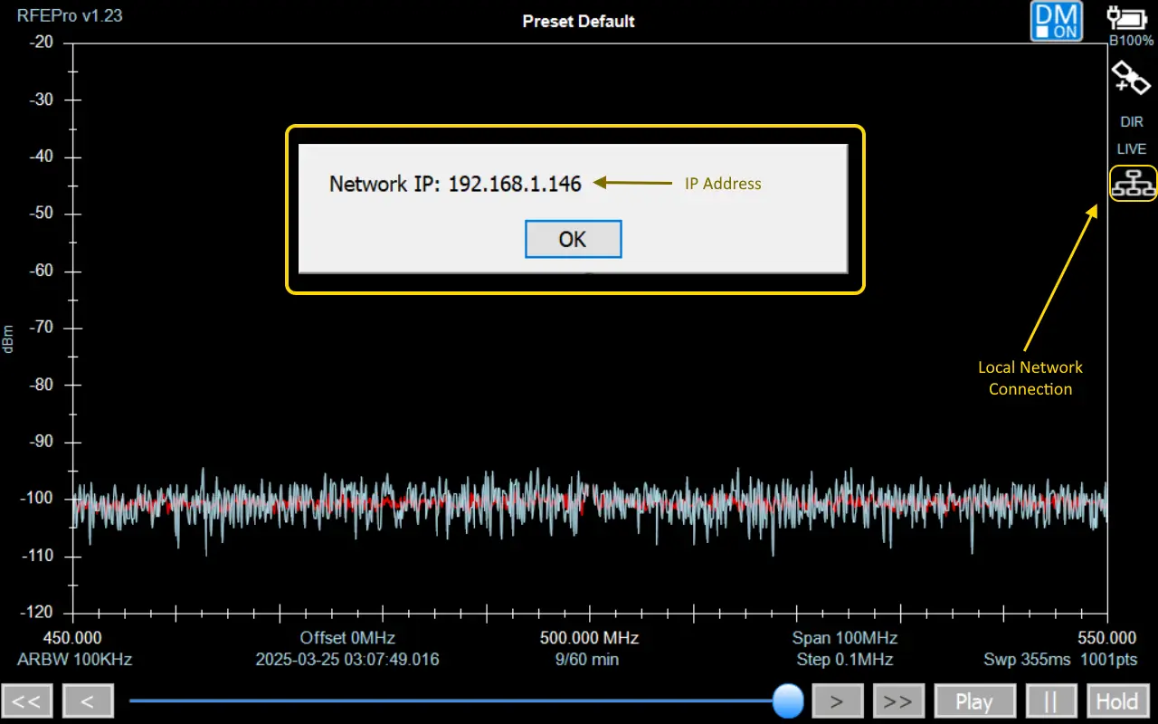 - You can now operate the RF Explorer Pro remotely, just as shown in the image.