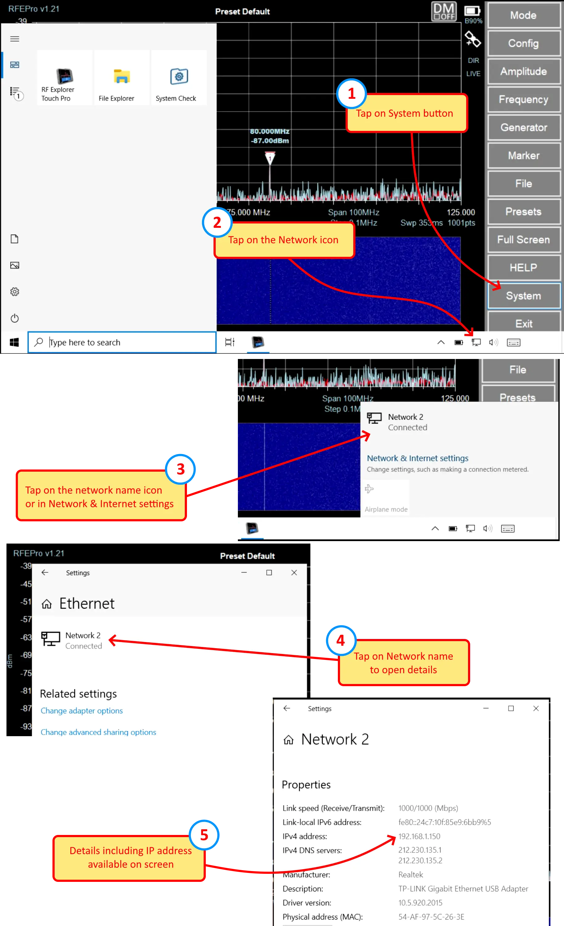 - Locate the IP address assigned to RF Explorer Pro in the properties section (step 5).