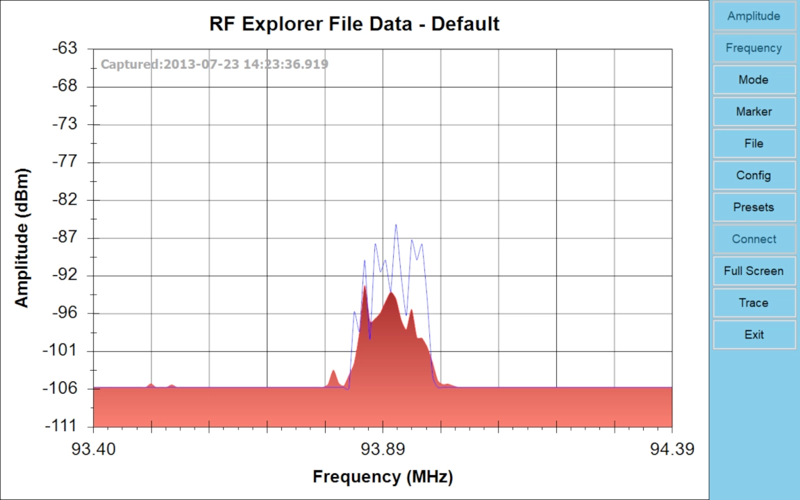 Once RFETouch application has been started, the software will connect with RF Explorer IoT device automatically if it is available and it will start capturing and displaying real-time data from RF Explorer IoT device after a few seconds. From there you can change frequency and amplitude settings with menus, as described in full user manual.