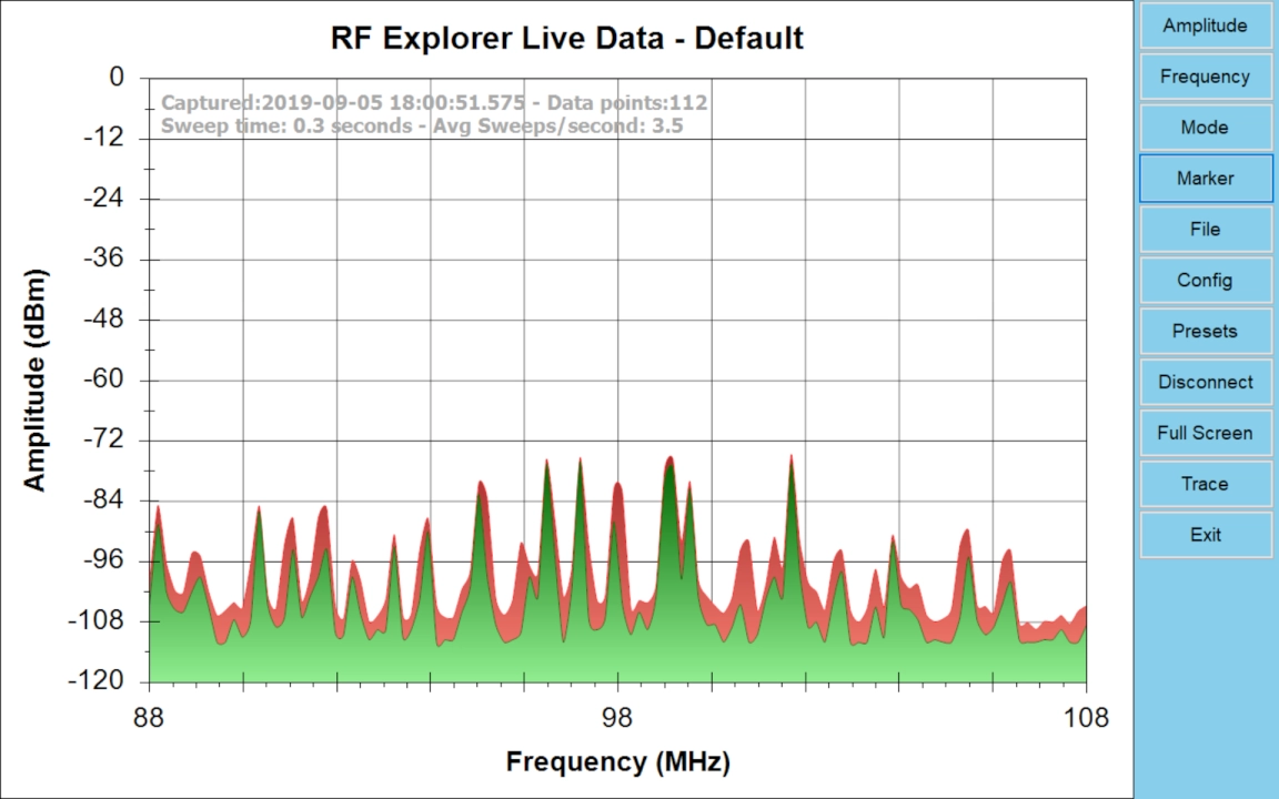 - Spectrum Analyzer graph will show captured activity in real time from FM radio channels, a possible example is displayed below.